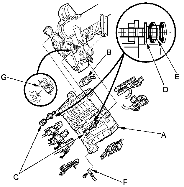 6. Release the lock (G), and pull the under-dash fuse/relay box away from the body.
