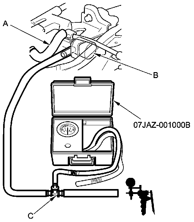 8. Disconnect the vacuum hose (purge line) (A) from the EVAP canister purge valve (B) in the engine compartment, then connect a T-fitting (C), a vacuum gauge, and a vacuum pump/gauge, 0-30 inHg, to the EVAP canister purge valve as shown.