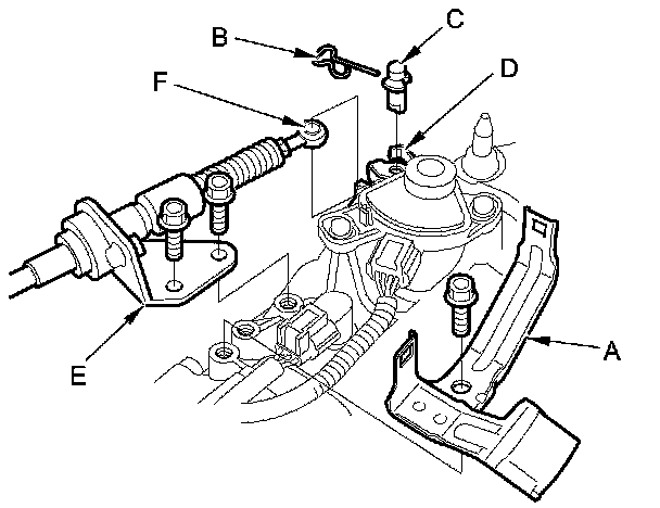 8. Remove the bolts securing the shift cable holder (E), then separate the shift cable (F) from the control lever.