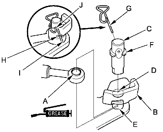 13. Insert the snap pin (G) in the direction shown through the control pin hole and out the opening (H) of the selector control lever so that the hooked end (I) of the snap pin snaps into the countersunk hole (J) of the control pin.