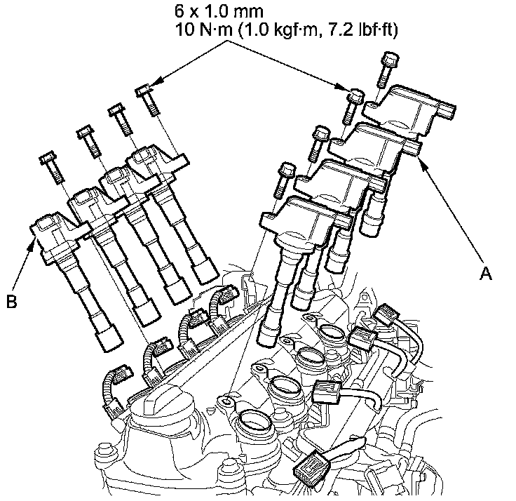 3. Disconnect the ignition coil connectors, then remove the intake side ignition coils (A) and the exhaust side ignition coils (B).