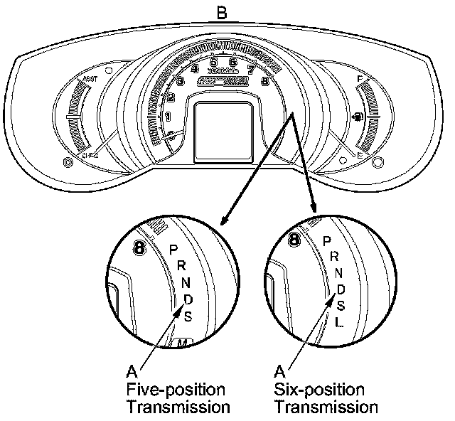 When the powertrain control module (PCM) senses an abnormality in the input or output system, the D indicator (A) in the gauge control module (B) will usually blink.