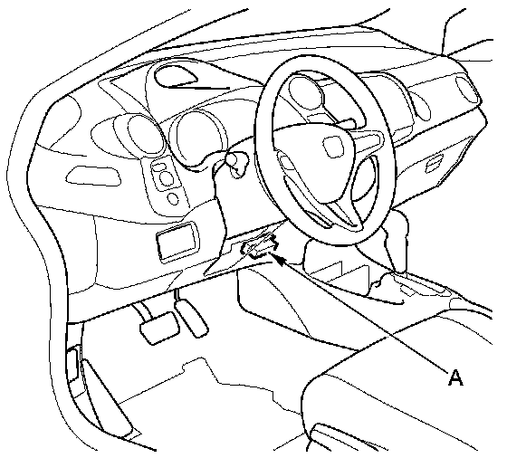 When the Honda Diagnostic System (HDS) is connected to the data link connector (DLC) (A) located under the driver's side of the dashboard and the SCS mode is selected, it will indicate the diagnostic trouble code (DTC) when the ignition switch is turned to ON (II) and the appropriate menu is selected.