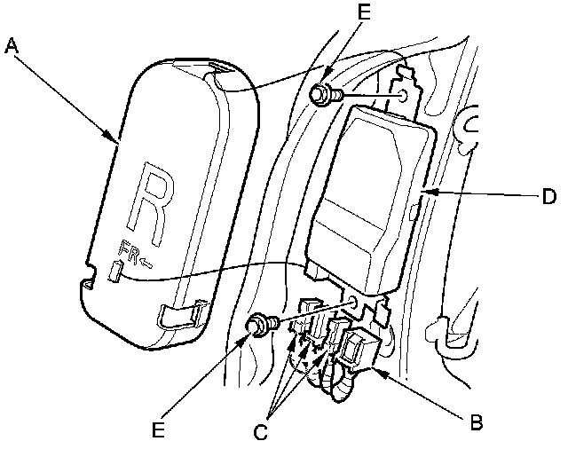 2. Connect the ODS unit harness 18P connector (C) and OPDS sensor connectors (D) to the ODS unit. Reinstall the cover (E).