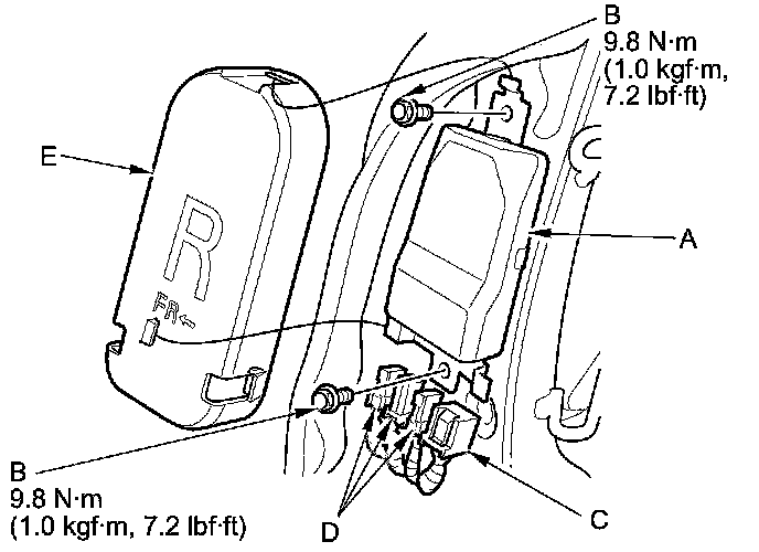 1. Place the ODS unit (A) on the seat-back frame. Install the two bolts (B).