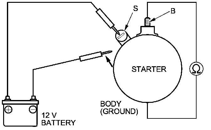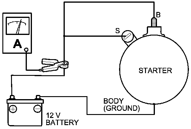 4. Connect the battery as shown, and check for continuity between the B terminal and the starter body. If there is continuity, it is working properly.