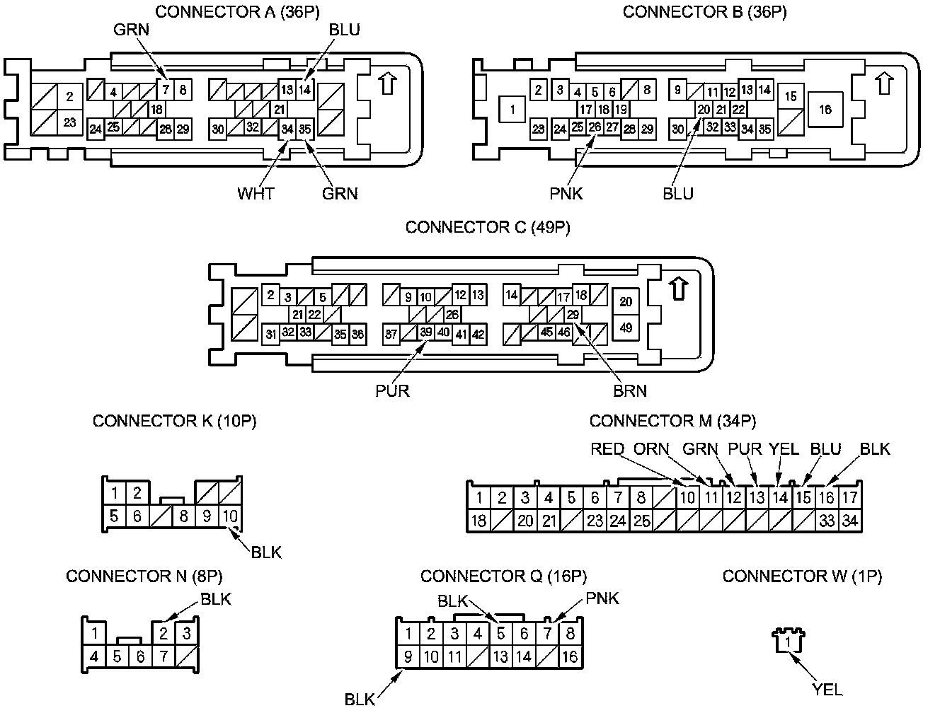 NOTE: All connector views are shown from wire side of female terminals.