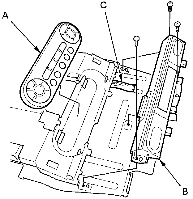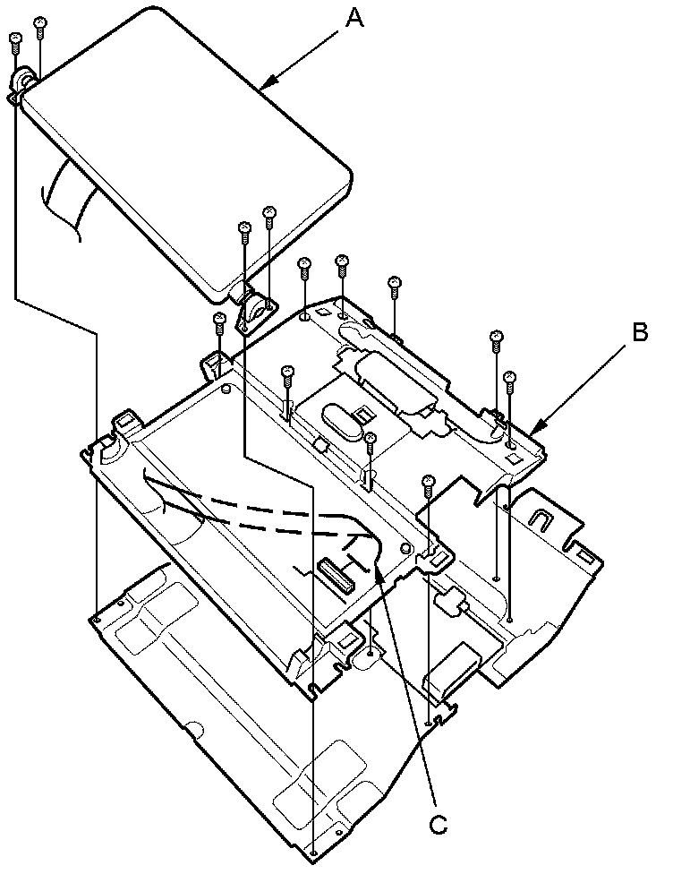 7. Remove the screws, then remove the screen (A) and base (B). Disconnect the cable (C).