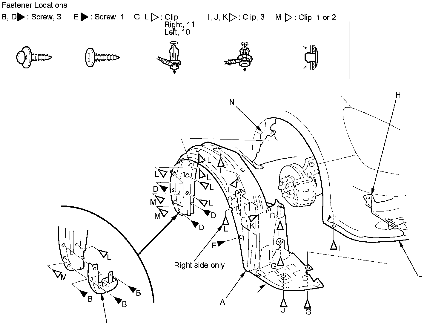 4. From the wheel arch, remove the clips (K, L, M) securing the front inner fender and the front fender fairing (N) on the body.