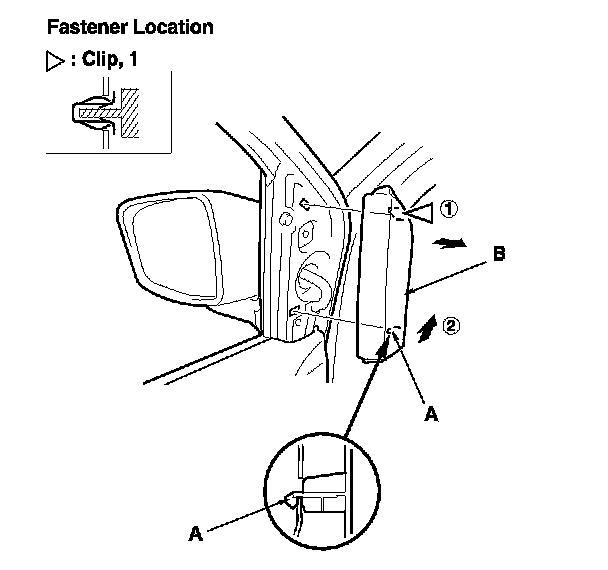 2. With your hand, carefully detach the clip, lift the mirror mount cover upward to release the hook (A), and remove the cover (B) in the sequence shown.