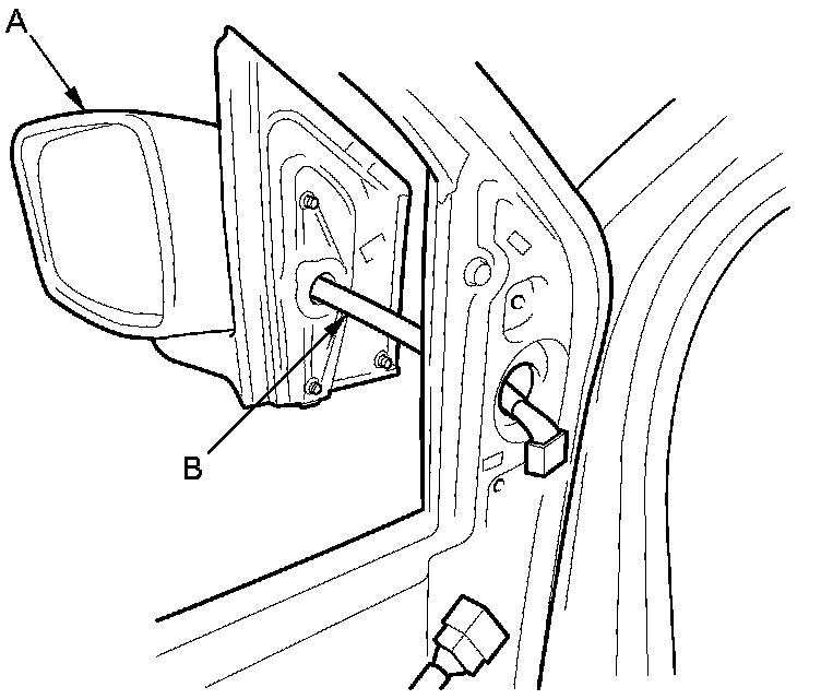 6. While holding the power mirror (A), pull out the harness (B) through the hole in the door.