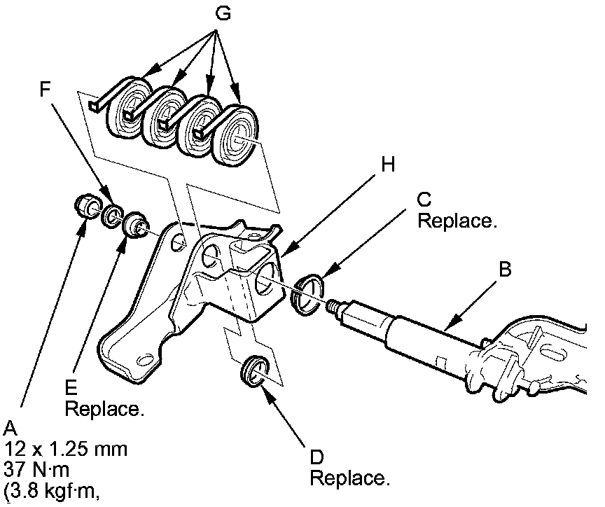 3. Remover the nut (A), then remover the pivot bracket (B), the bushings (C, D, E), the washer (F), and the spiral springs (G) from the pivot base (H).