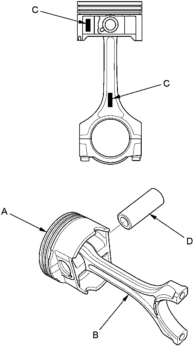 4. Assemble the piston (A) and the connecting rod (B) with the embossed marks (C) on the same side. Install the piston pin (D).
