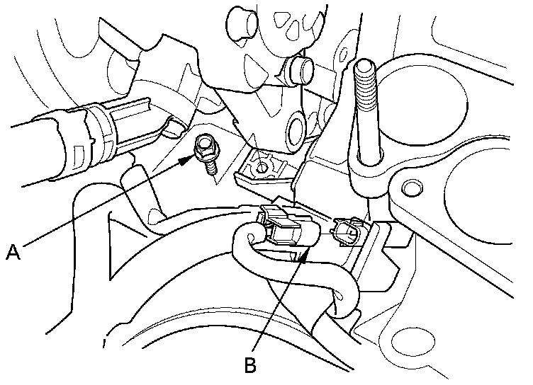 5. Remove the harness holder mounting bolt (A) and disconnect the knock sensor connector (B).
