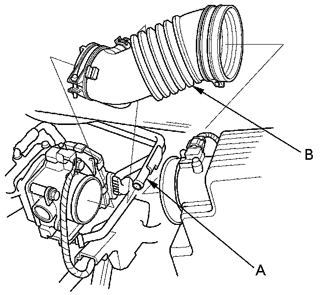 8. Disconnect the breather pipe (A), then remove the intake air duct (B).