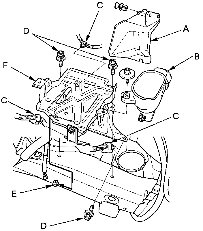 11. Remove the three mounting bolts (D) and loosen the mounting bolt (E), then remove the battery base (F).