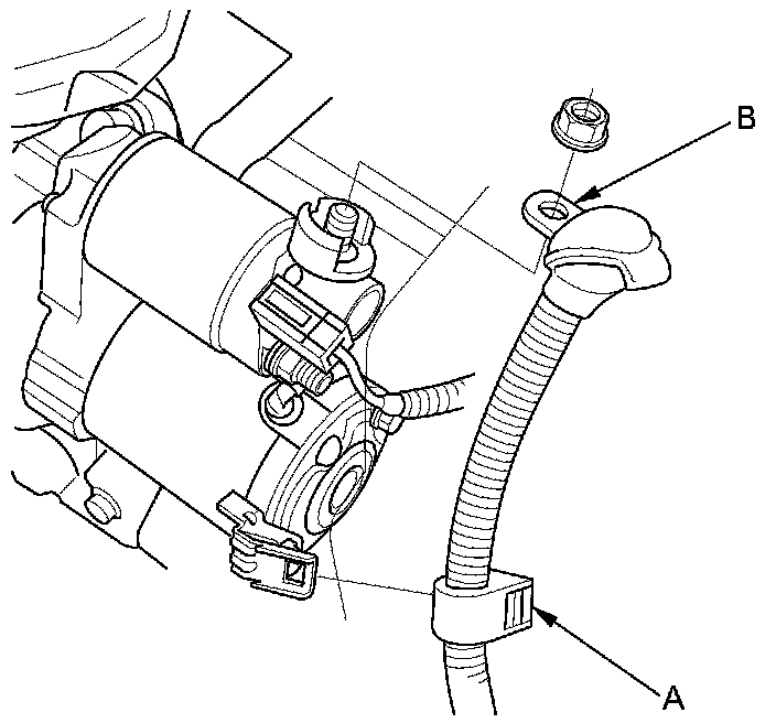 13. Remove the harness clamp (A), then disconnect the positive starter cable (B) from the B terminal.