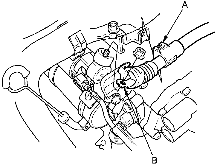 23. J35A6, '07 model J35A7 engines: Remove the harness clamps (A), then disconnect the positive alternator cable (B).