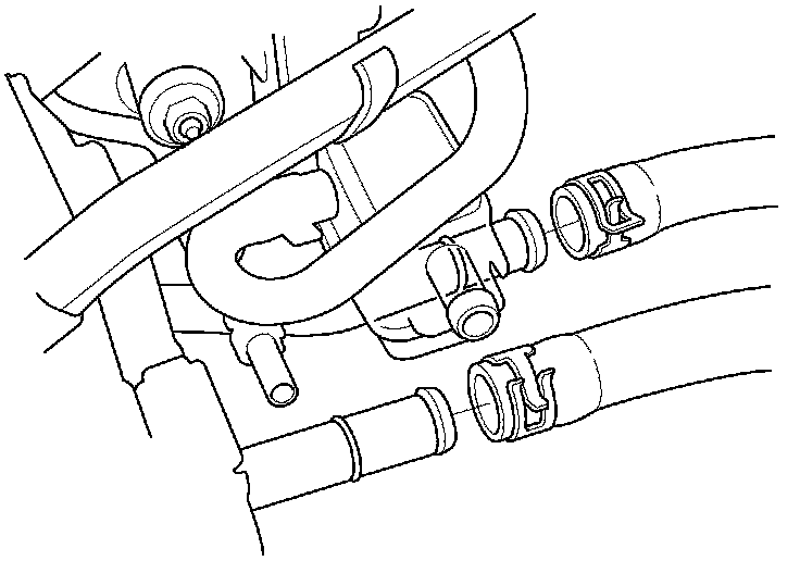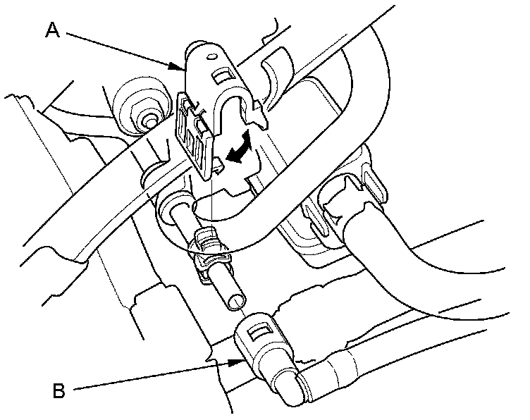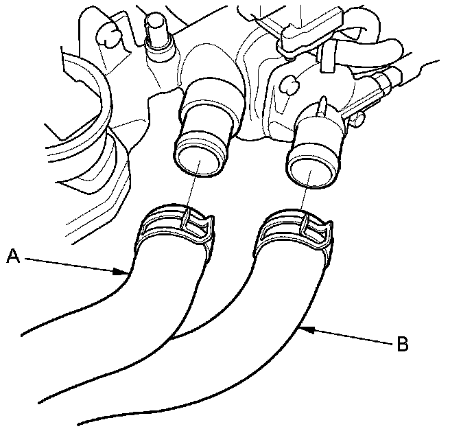 15. Disconnect the brake booster vacuum hose (A) and the evaporative emission (EVAP) canister hose (B).