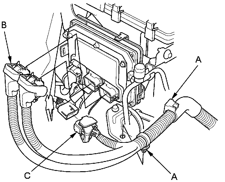22. Remove the harness clamps (A), then disconnect the engine wire harness connectors (B) and the cabin wire harness connector (C) on the right side of the engine compartment.