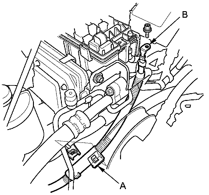 24. '08-10 models J35A7 engine: Remove the harness clamp (A), then disconnect the battery cable (B) from the under-hood fuse/relay box.