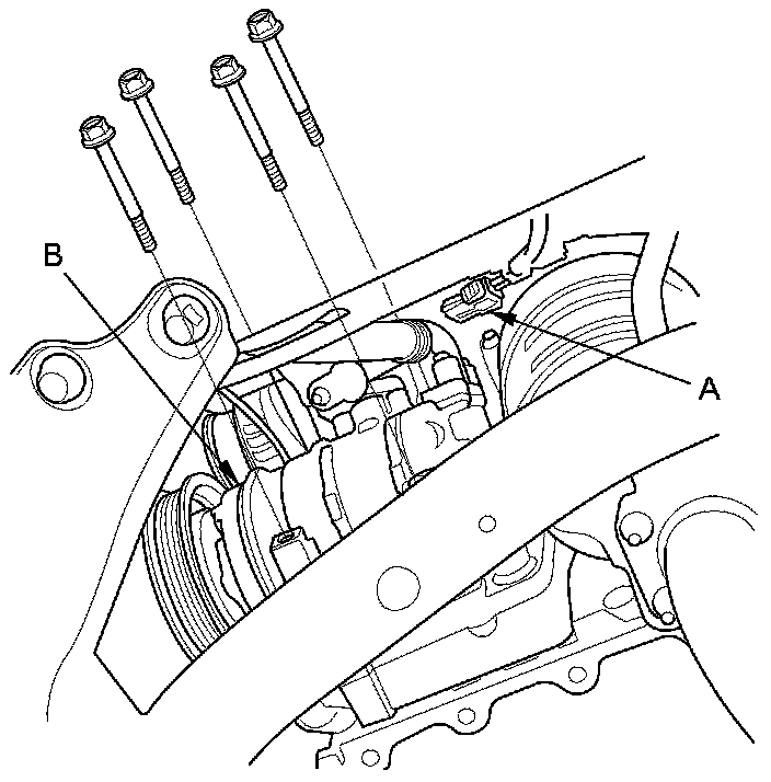 51. Disconnect the A/C compressor clutch connector (A), then remove the A/C compressor (B) without disconnecting the hoses. Do not bend the A/C hoses excessively.