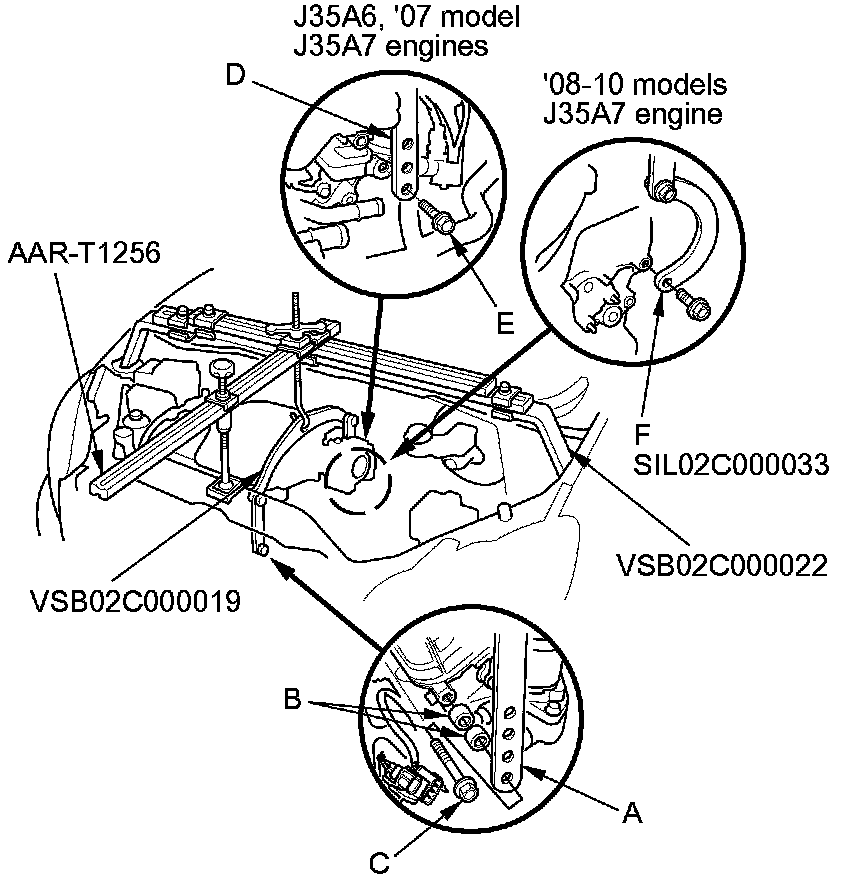 58. '08-10 models J35A7 engine: Lift and support the engine with the engine support hanger and the engine hanger balance bar. Attach the front arm to the front cylinder head with several spacers and a 10 x 1.25 mm bolt. Attach the 2008 V6 attachment arm (SIL02C000033) (F) to the rear cylinder head with a 8 x 1.25 mm bolt, then attach the rear arm to the 2008 V6 attachment arm.