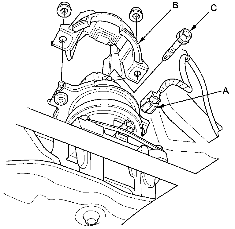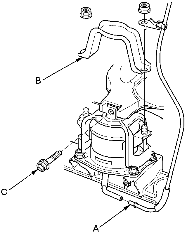 63. J35A7 engine: Disconnect the rear engine mount actuator connector (A), and remove the rear engine mount stop (B), then remove the rear engine mount bolt (C).