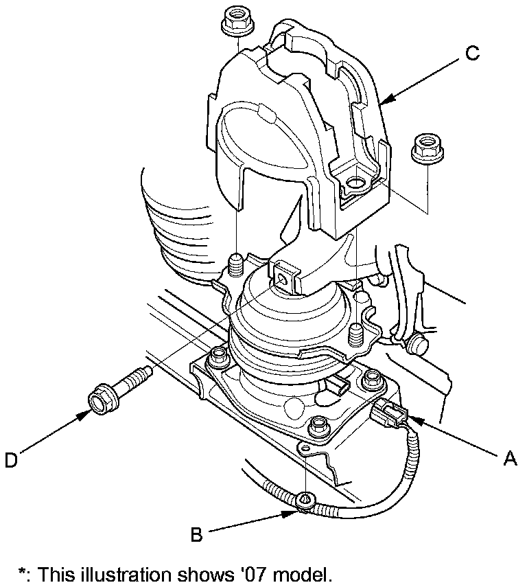 60. J35A7 engine: Disconnect the front engine mount actuator connector (A) and the harness clamp (B). Remove the front engine mount stop (C), then remove the front engine mount bolt (D).