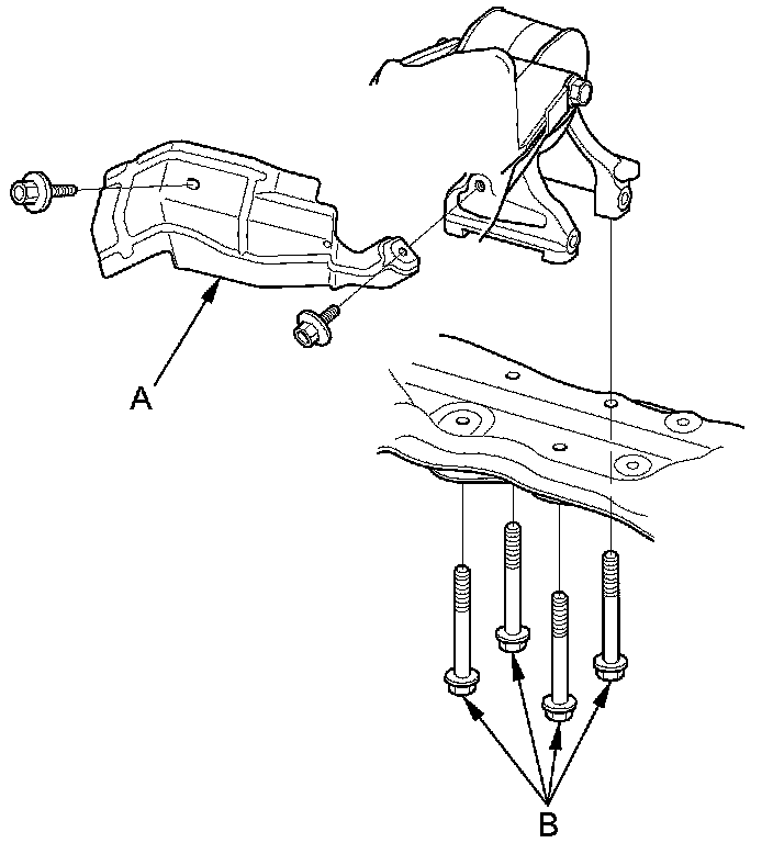 62. J35A6 engine: Remove the heat shield (A) and the rear engine mount bolts (B).