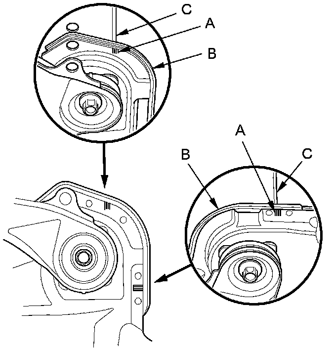 64. Make the appropriate reference lines (A) at the both side of the front subframe (B) that line up with the edge (C) on the body.
