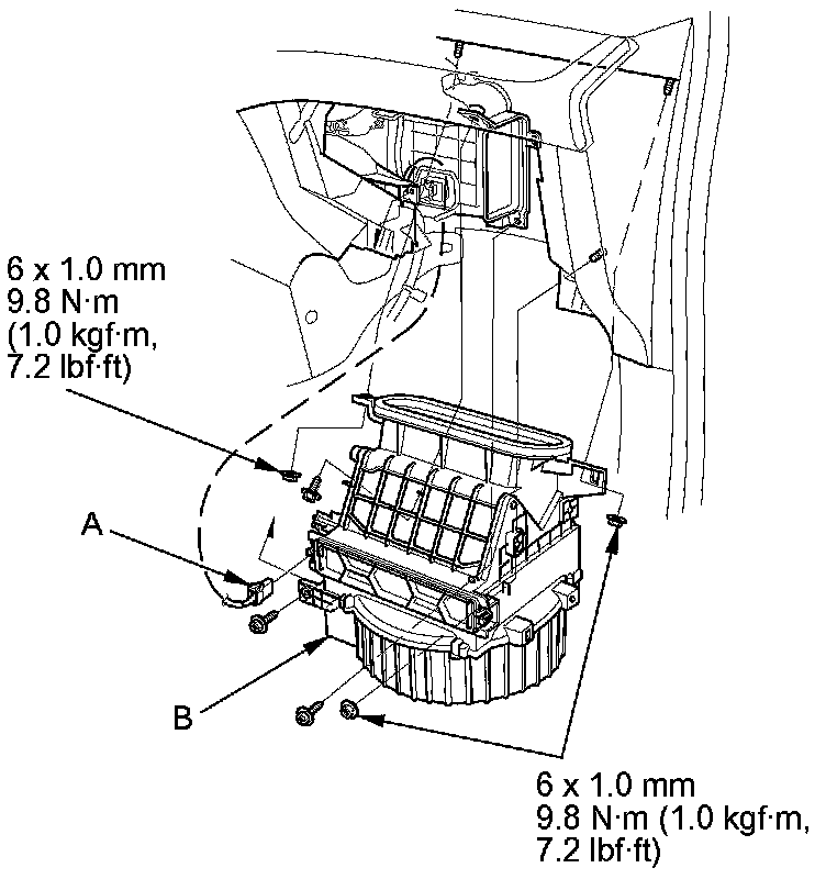 5. Disconnect the connector (A) from the recirculation control motor, then remove the bolts, the mounting nuts and the blower unit (B).