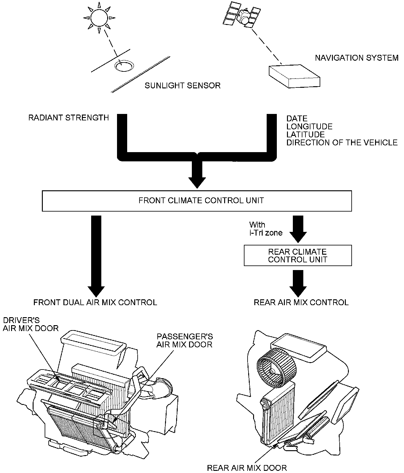 The "i-Dual zone" climate control system automatically controls the temperature and the vent mode of the air direction to the driver's and passenger's side, depending on the angle of the sun, and the direction of the vehicle. It calculates information such as date, time, longitude, and latitude from the navigation system, as well as the radiant strength of the sun from the sunlight sensor, to determine the appropriate mode position and temperature to be directed to each side. The "i-Tri zone" climate control system is an addition of the automatic controls with the temperature and the vent mode of the air direction to the rear section to the "i-Dual zone" climate control system.