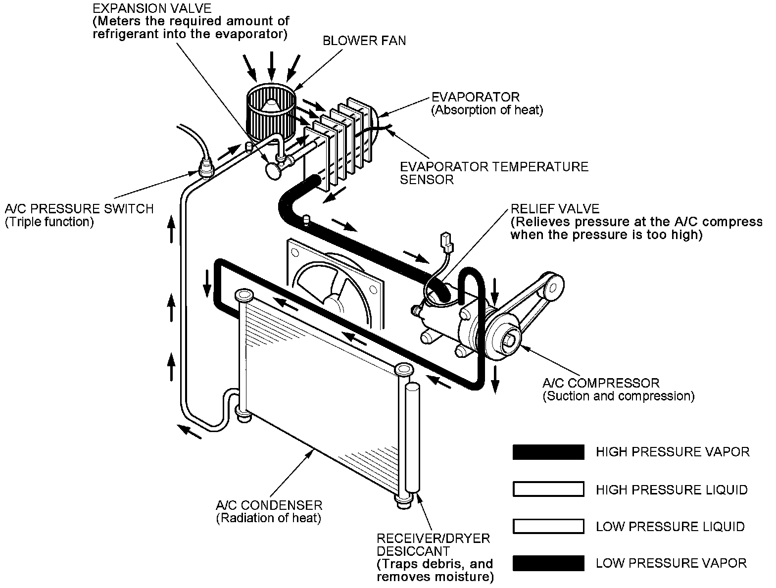 The air conditioning (A/C) system removes heat from the passenger compartment by transferring heat from the ambient air to the evaporator. The A/C refrigerant expands in the evaporator, and the evaporator becomes very cold and absorbs the heat from the ambient air. The blower fan pushes air across the evaporator where the heat is absorbed, and then it blows the cool air into the passenger compartment.