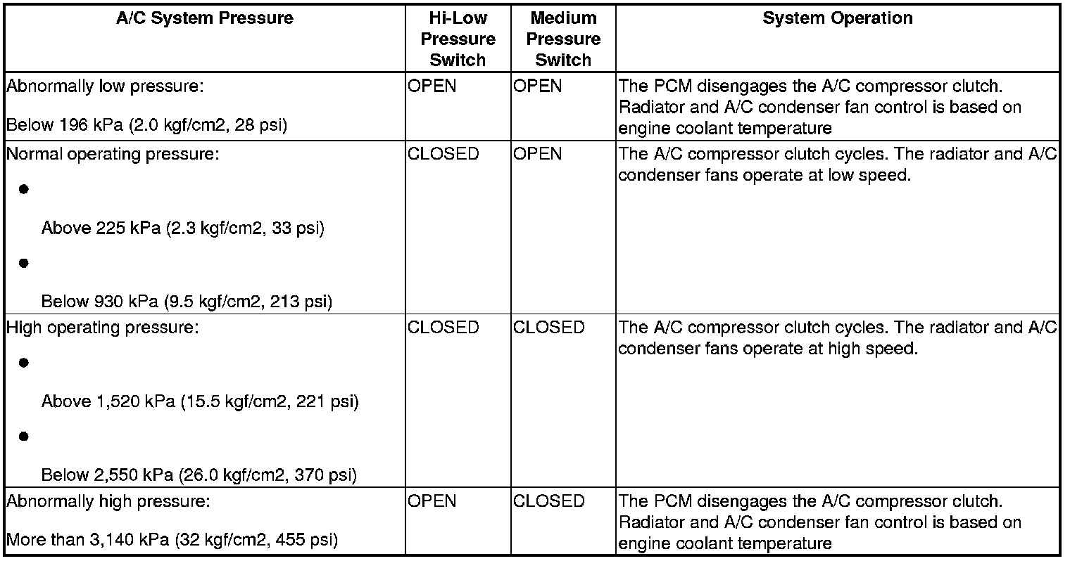 If the refrigerant pressure goes above 1,520 kPa (15.5 kgf/cm2, 221 psi), the A/C pressure switch closes to signal the PCM to change the speed of the A/C condenser fan and radiator fan to high. When the refrigerant pressure drops below 930 kPa (9.5 kgf/cm2, 135 psi), the A/C pressure switch opens to signal the PCM to change the speed of the A/C condenser fan and radiator fan to low.