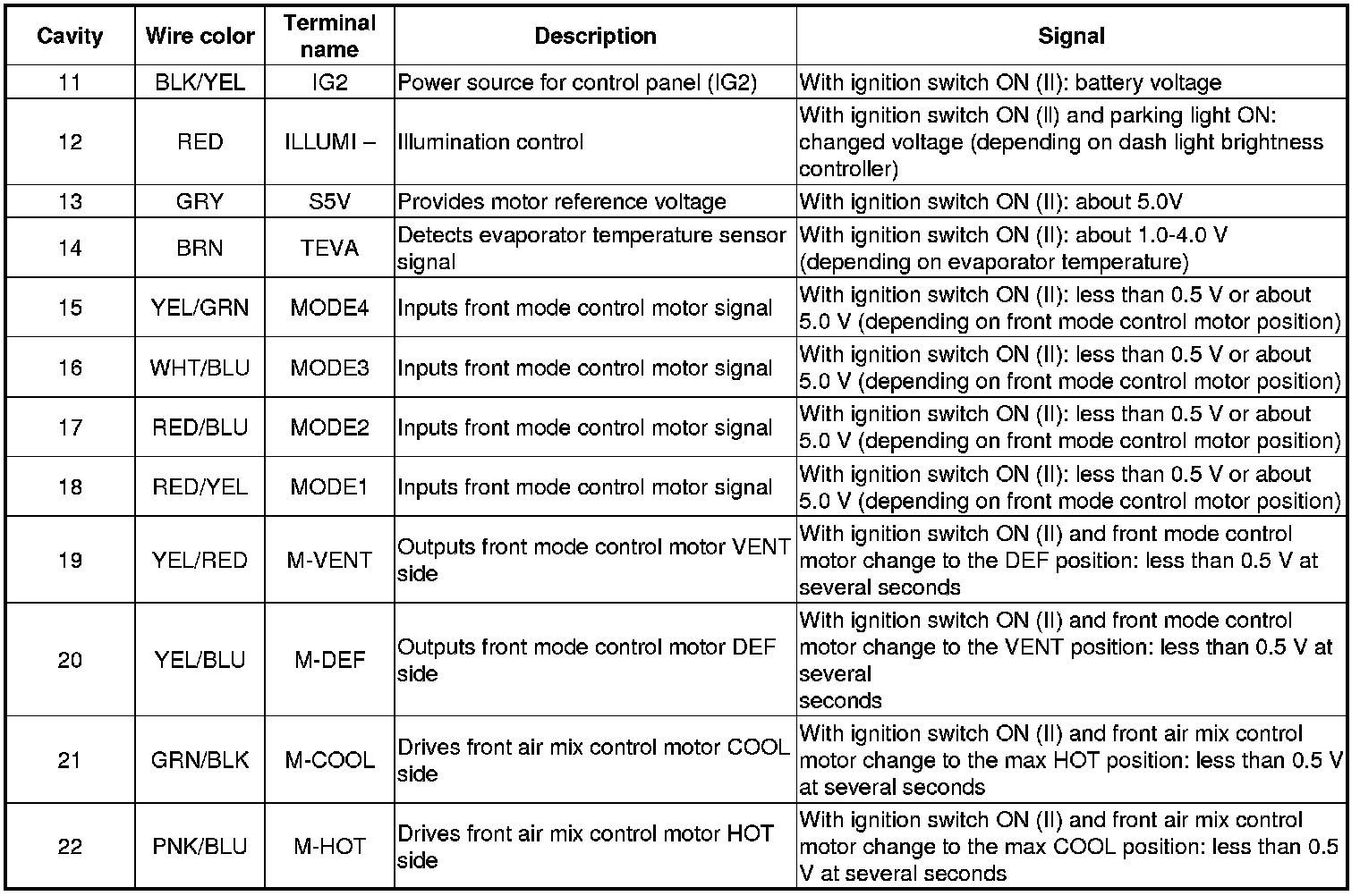 A/C CONTROL PANEL CONNECTOR A (22P)