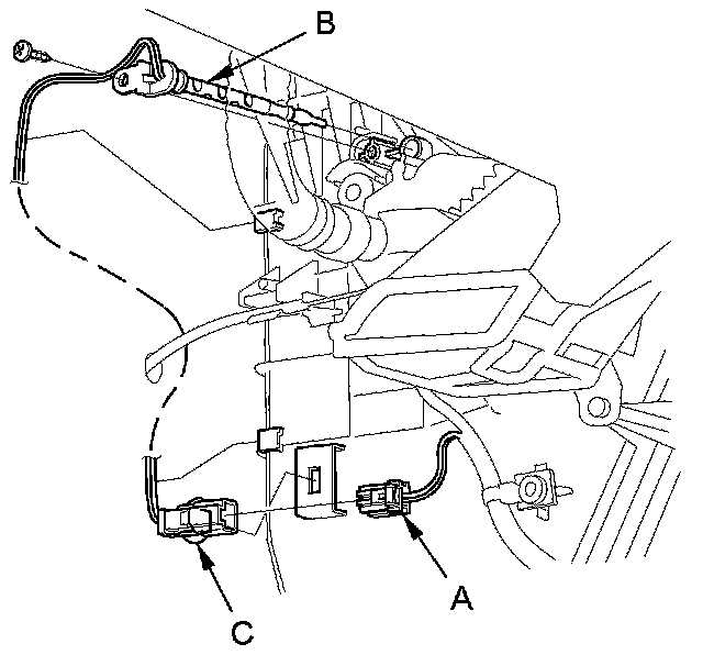 2. Disconnect the 2P connector (A) from the evaporator temperature sensor (B), then remove the connector clip (C). Remove the self-tapping screw, and carefully pull out the evaporator temperature sensor.