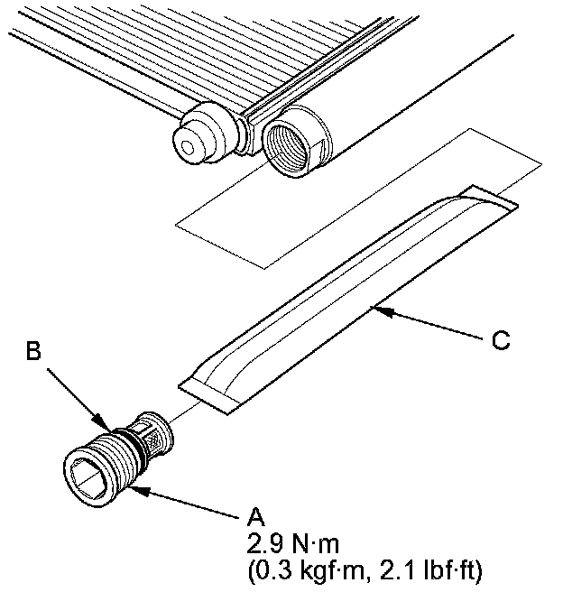 2. Remove the cap (A) from the bottom of the A/C condenser. Remove the O-ring (B) and the desiccant (C).