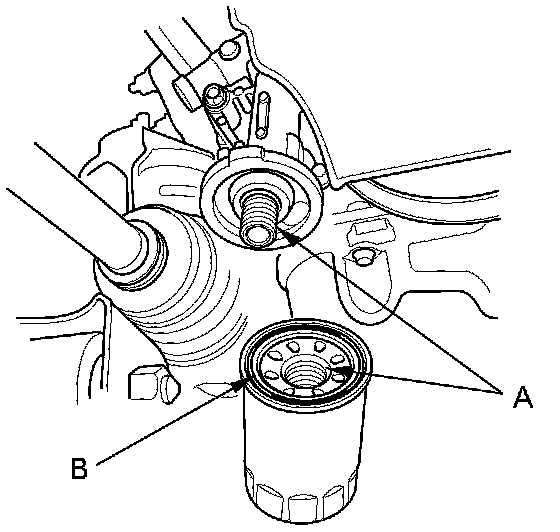 3. Inspect the threads (A) and the rubber seal (B) on the new filter. Clean the seat on the oil filter base, then apply a light coat of new engine oil to the filter rubber seal. Use only filters with a built-in bypass system.