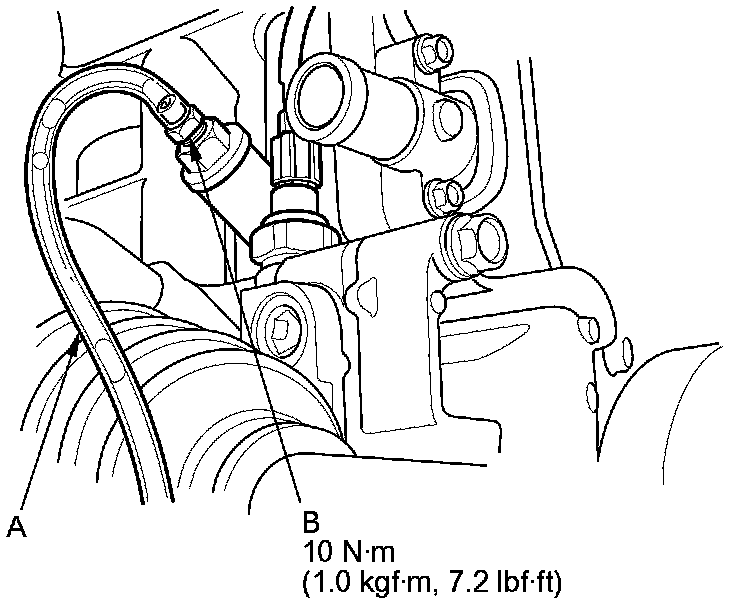 4. Install a rubber hose (A) on the drain bolt (B) located at the rear of the engine block, then loosen the drain bolt.