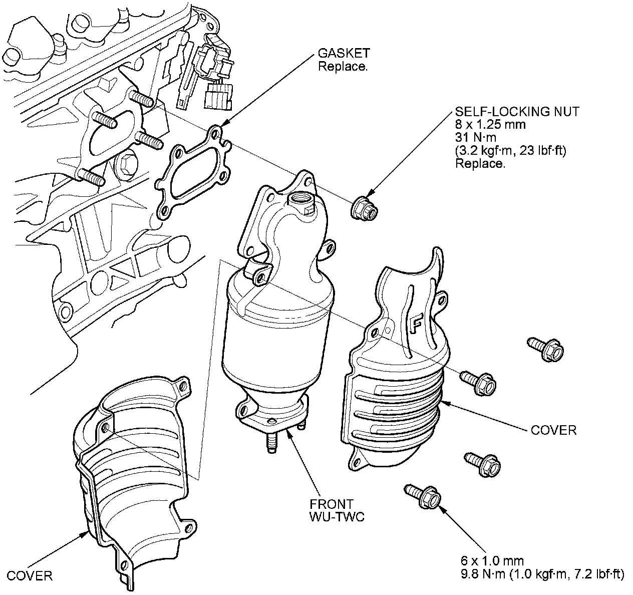 2. Remove the front A/F sensor (Sensor 1) A/F Sensor Replacement and the front secondary HO2S (Sensor 2) Secondary HO2S Replacement.