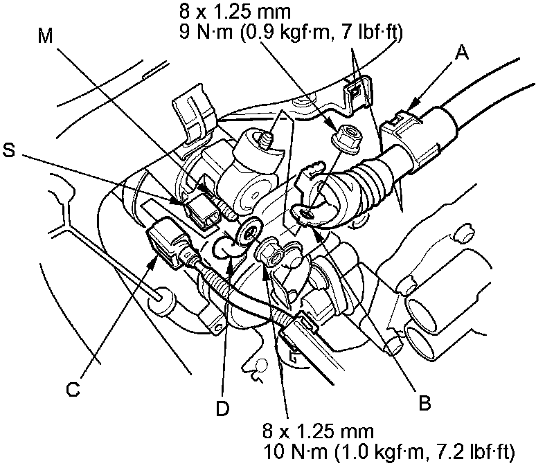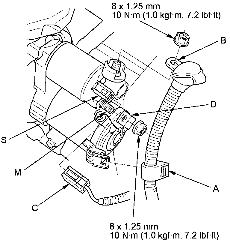 2. Remove the harness clamp (A), then disconnect the positive starter cable (B), the S terminal connector (C), and the motor wire (D).