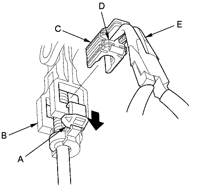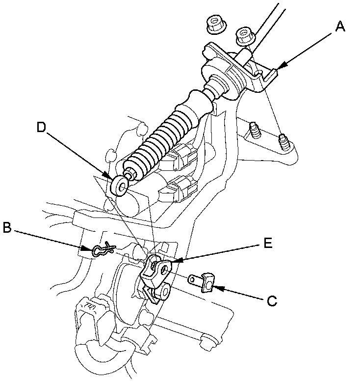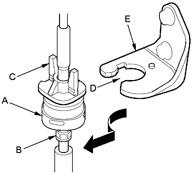 7. Rotate the socket holder (A) on the shift cable (B) a 1/4 turn; the guide tab (C) on the socket holder will be perpendicular to the opening (D) of the socket holder bracket (E). Then slide the socket holder to remove the shift cable from the socket holder bracket.