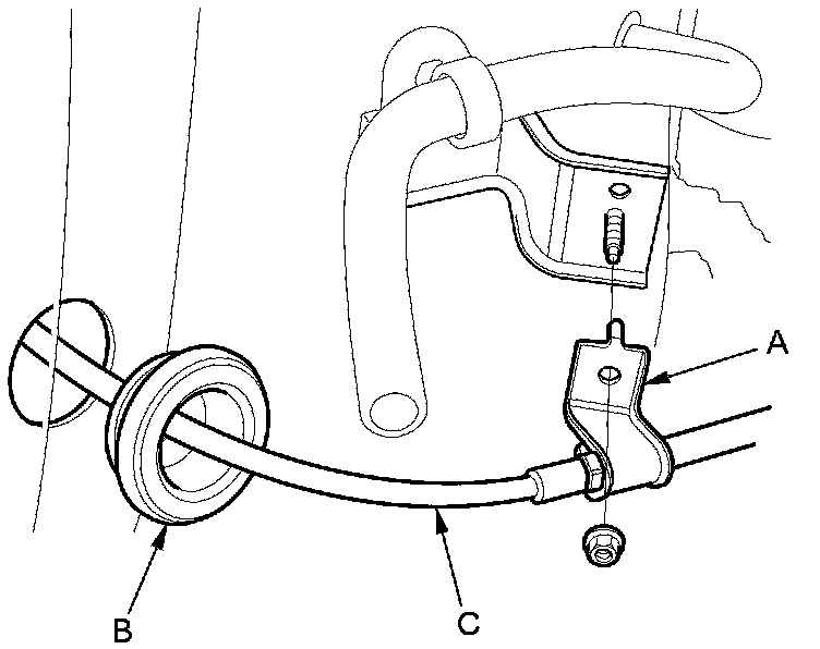 8. Remove the shift cable bracket (A) and the grommet (B), and pull out the shift cable (C).