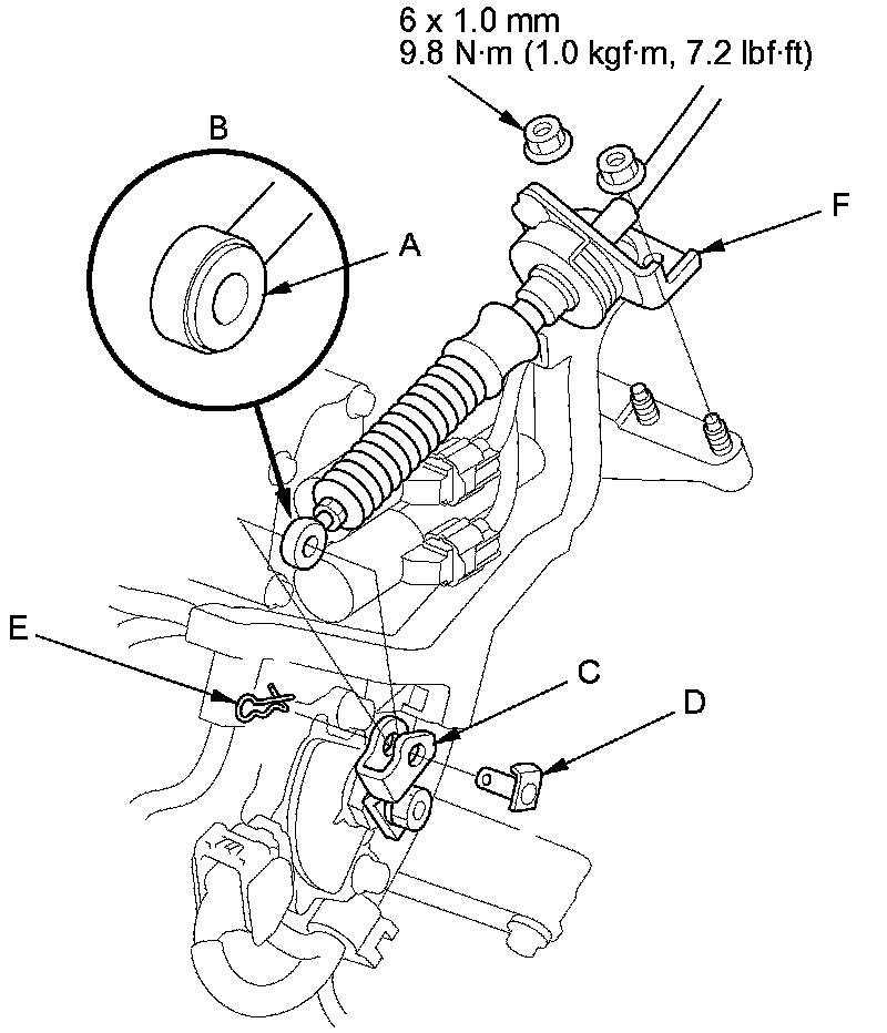 14. Apply molybdenum grease to the hole in the bushing (A) in the shift cable end (B). Attach the shift cable end to the control lever (C), then insert the control pin (D) into the control lever hole through the shift cable end, and secure the control pin with the spring clip (E).