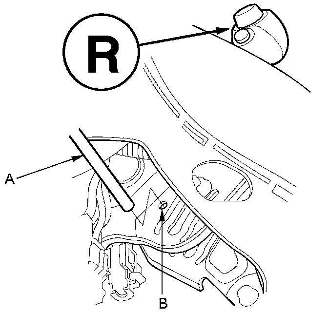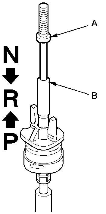 17. If necessary, push the shift cable (A) until it stops, then release it. Pull the shift cable back one step so that the shift cable is in the R position. Do not hold the shift cable guide (B) to adjust the shift cable.