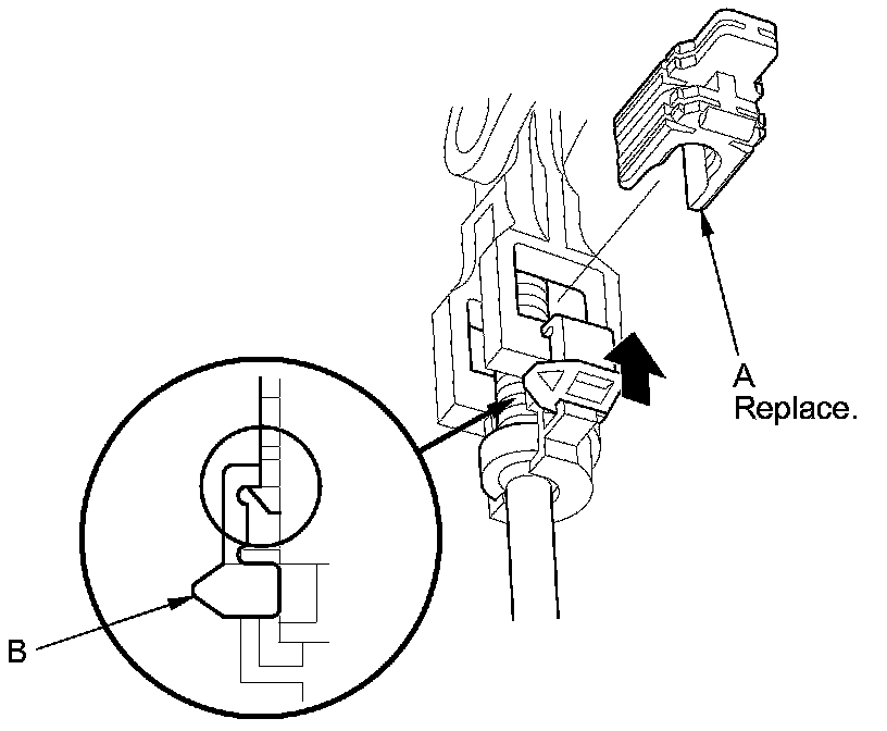 22. Install a new shift cable lock (A) to secure the shift cable end and the shift cable end holder, then push the lock tab (B) up until it stops to lock the joint.