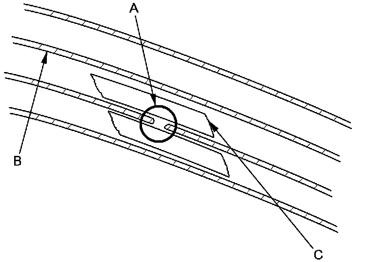 2. Carefully mask above and below the broken portion of the defogger wire (B) with cellophane tape (C).