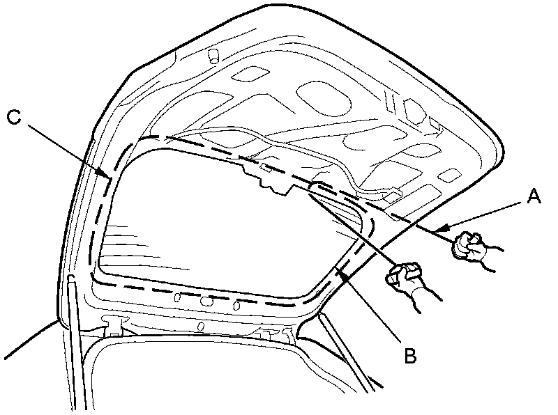 5. With a helper on the outside, pull the piano wire (A) back and forth in a sawing motion. Hold the piano wire as close to the rear window (B) as possible to prevent damage to the tailgate, and carefully cut through adhesive (C) around the entire rear window.