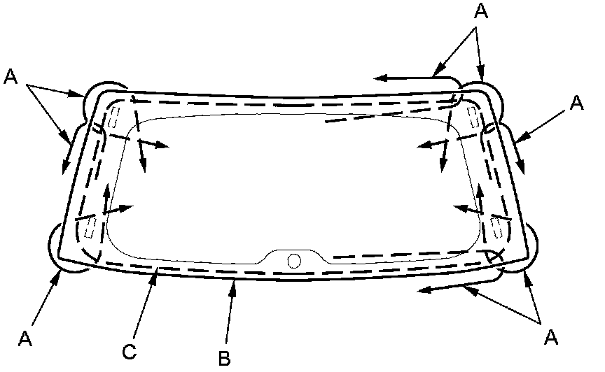 14. Apply a light coat of glass primer to the rear window (A) along the edge of the upper rubber dam (B) and the lower rubber dam (C) as shown, then lightly wipe it off with gauze or cheesecloth: